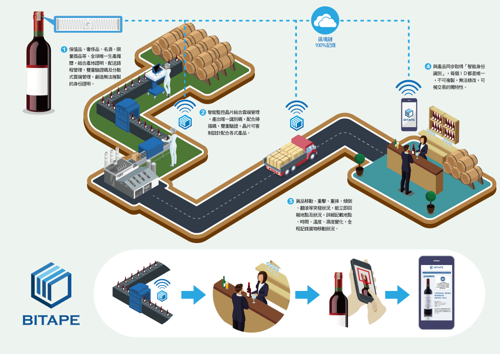 防偽監控感測器結合電子身份合約,以及防偽晶片揉合區塊鏈技術,提供原廠於商品出廠時,將生產履歷數據加密編碼成證書上鏈。消費者可以透過下載官方APP驗證產品是否為正版商品,以APP中的金鑰認證晶片,以及驗證電子合約達到雙重驗證。